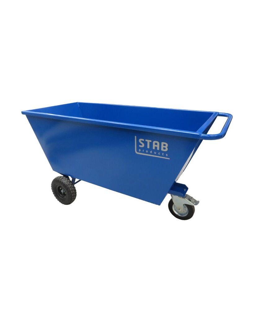 Tillverkad i 3mm plåt. Utrustad med tvådelat fällbart lock samt gaffeltunnlar för smidig förflytning. Reglerad tömning med hjälp av saxlås.