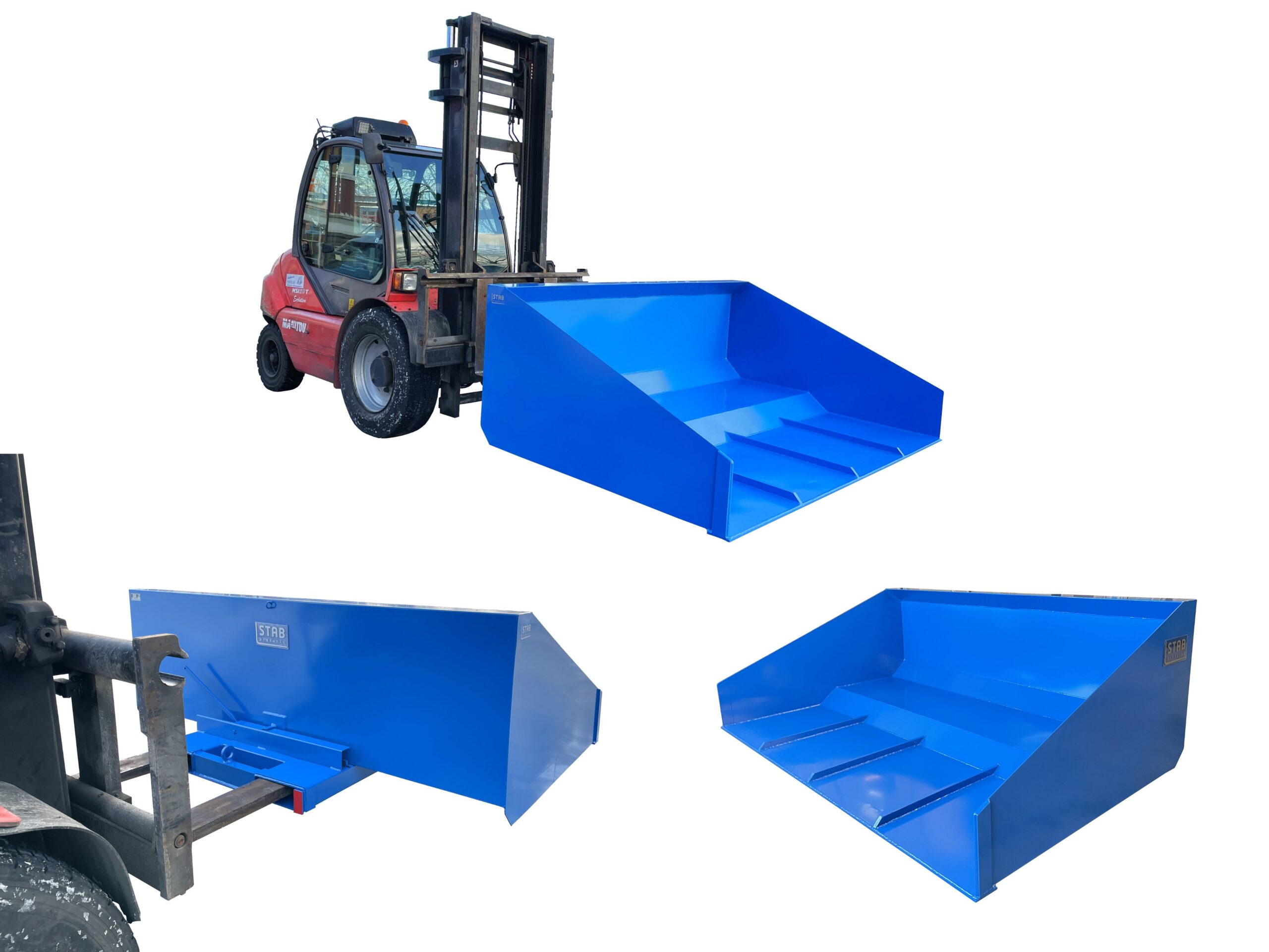 STAB snö, grus och flisskopa. Självtömmande skopa i kraftigt utförande som tål att hanteras tufft. Skopan tippar via en tvärgående axel och öppnas som standard via handspak. Som tillbehör kan vi rekommendera ATG då man får en ”hydraulfunktion” till en låg merkostnad. Den är mycket lätt att montera på truckens gafflar. Ett användbart redskap i fler sammanhang än vid snöröjning, t.ex hantering av spannmål, trä & metallspån, lastning av grus mm. Skopan finns i två storlekar och passar alla gaffeltruckar. Vi kan även specialtillverka enl. Era önskemål